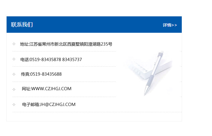 傳真:0519-83435688    郵編:213135    網址:WWW.czjhgj_com.applegogogo.com    電子郵箱:JH@czjhgj_com.applegogogo.com